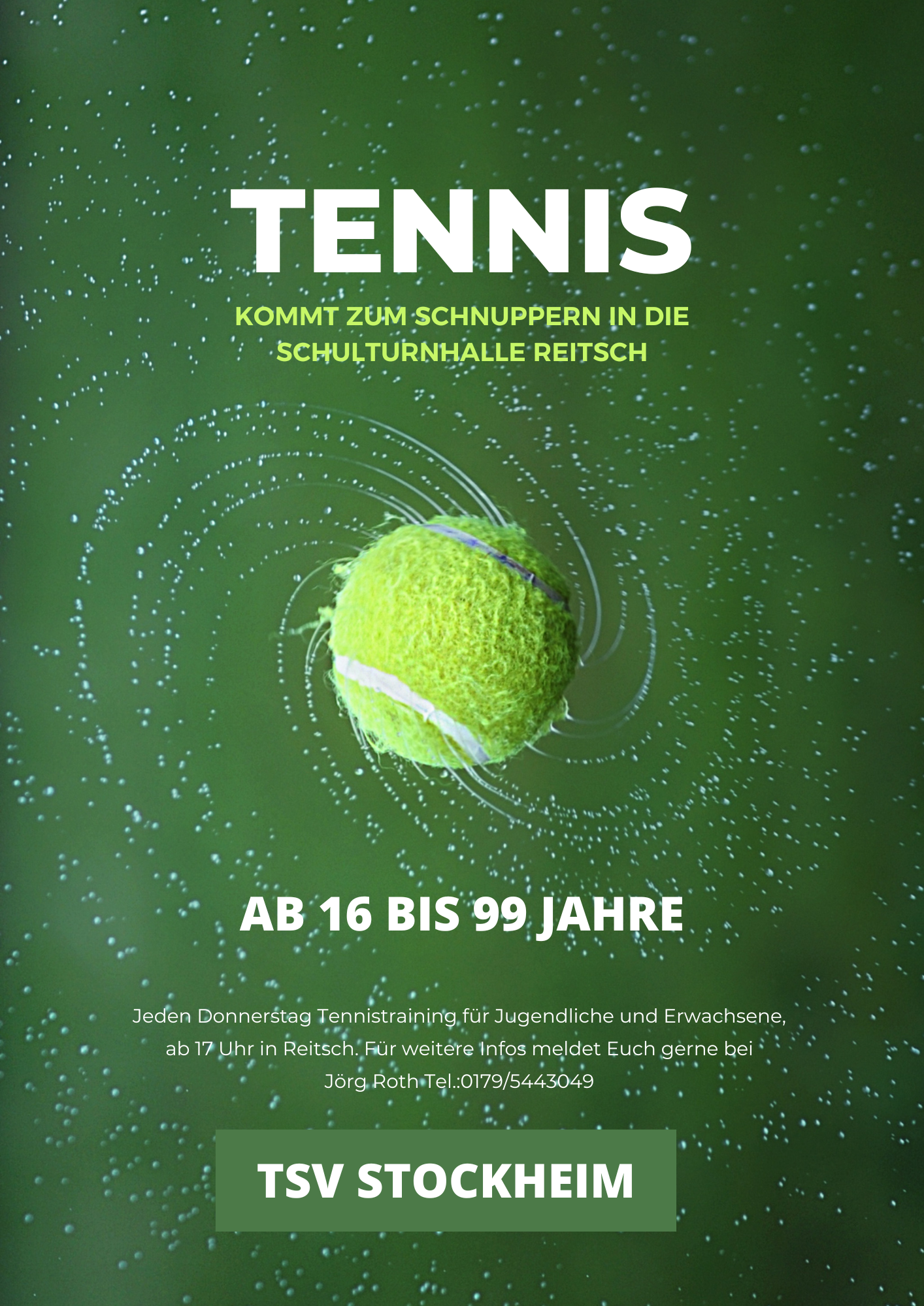 Tennis ist ein Sport für jedermann! Daher bietet der TSV Stockheim ein Tennistraining für Jugendliche und Erwachsene an. Kommt gerne vorbei und schnuppert rein! Mehr Informationen gibt es bei Jörg Roth – 01795443049